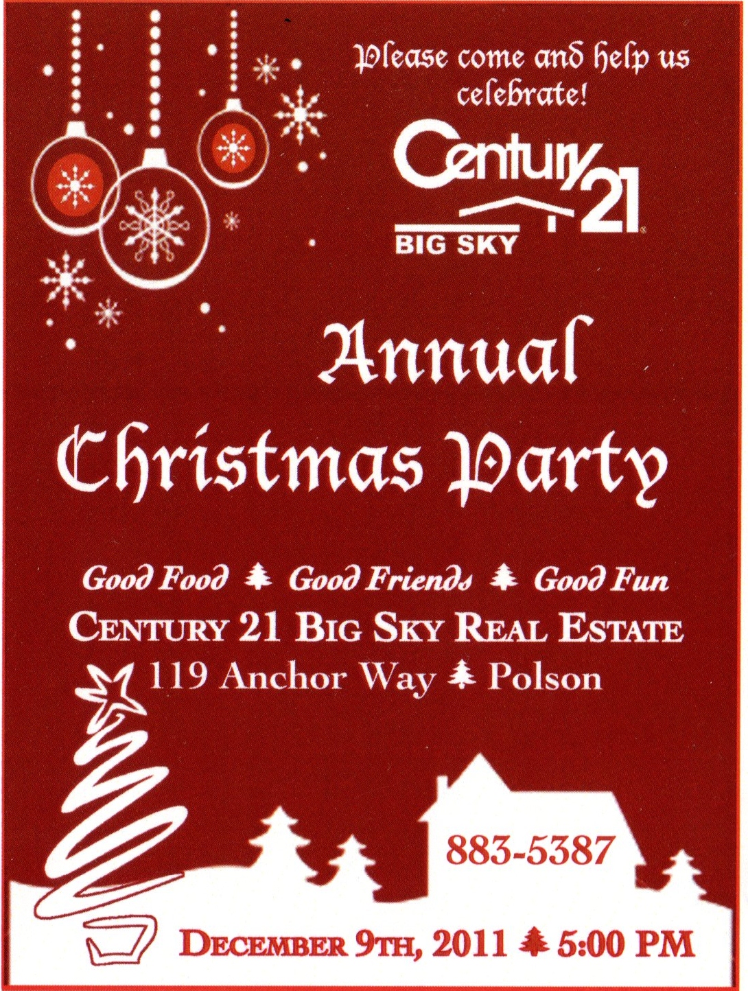 Century 21 Big Sky's 40th annual Christmas Party (we have lost track of the count after so many years) is being held this year on December 9, 2011 beginning at 5pm. Please come for food and good company. MERRY CHRISTMAS.