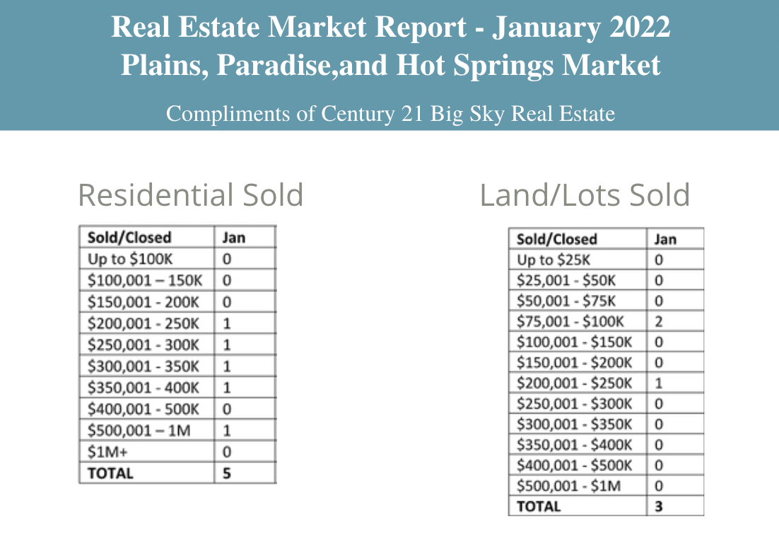 Click on Read More to view the Plains, Paradise & Hot Springs Montana Real Estate Market Report for January 2022. See the number of homes and lots that sold last month.